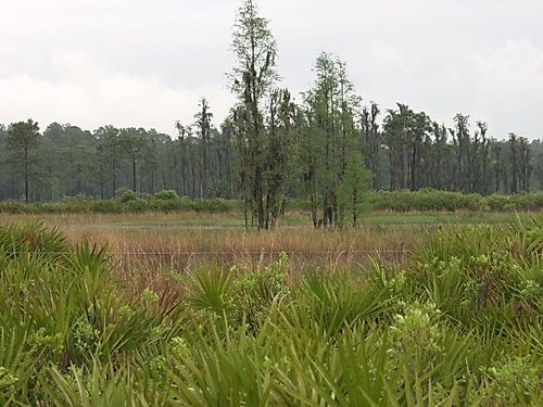 Typical vegetation includes maidencane ( Panicum hemitomon ), fireflag ( Thalia geniculata ), pickerelweed ( Pontederia cordata ), and other emergent species. Frequently, vegetation is arranged in concentric zones, reflecting differences in hydroperiod: inner zones are often monospecific, while the outer transition zone into adjacent flatwoods supports high species diversity.
