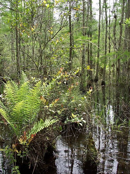 Typical vegetation includes pond cypress ( Taxodium ascendens ) and swamp blackgum ( Nyssa sylvatica var. biflora ) in the center. Toward the margins, in shorter-hydroperiod zones, common species include sweetbay magnolia ( Magnolia virginiana ), loblolly bay ( Gordonia lasianthus ), swamp bay ( Persea palustris ), and swamp laurel oak ( Quercus laurifolia ).